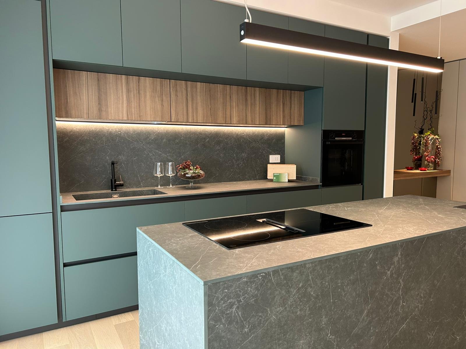 La cucina è moderna, con molti cassetti e ripiani dove riporre gli utensili, un piano di lavoro, gli elettrodomestici si celano su delle colonne del colore della parete e poi, l'immancabile cantina per i vini; abbiamo aggiunto un'isola rettangolare con un ripiano, dove ti immaginiamo fare colazione assieme i tuoi cari. Davanti la cucina, poi, c’è spazio per il tavolo : riesci a pensare a quante belle cene con amici a parenti riuscirai ad organizzare?